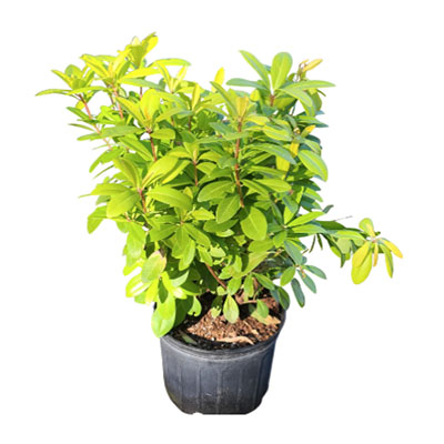 Pittosporum Variegated is a evergreen shrub with green leaves edged in creamy white and a compact, rounded habit. Perfect for brightening hedges, borders, and foundation plantings.