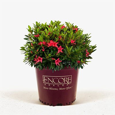 Azalea Encore is a compact, evergreen azalea shrub with flushes of colorful blooms in spring, summer, and fall. Ideal for foundation plantings, borders, and mass plantings in partial shade to sun.